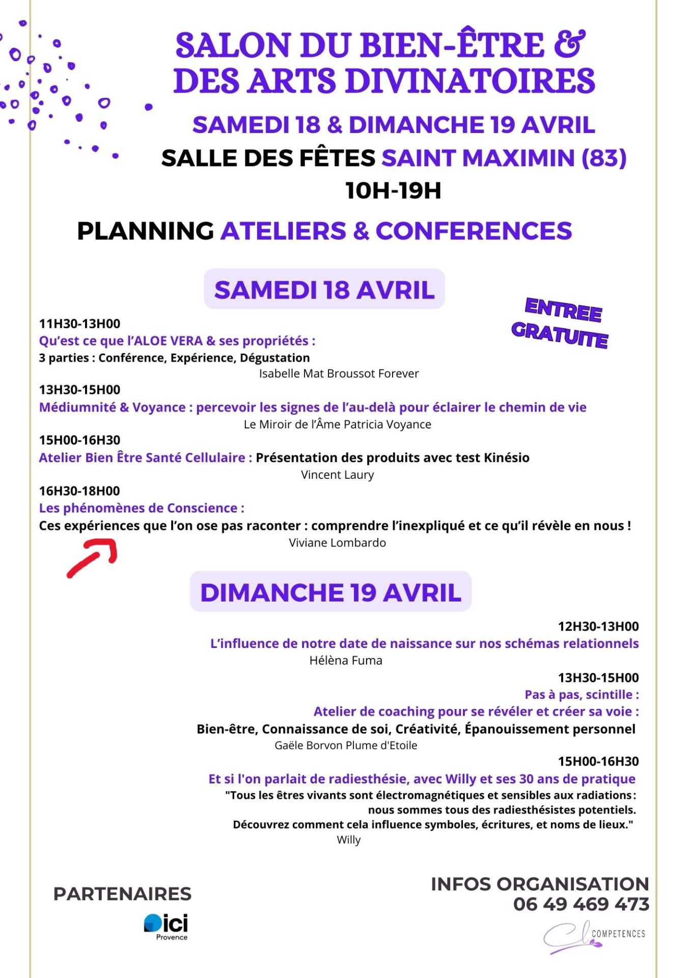 Nous vous convions les Samedi 18 et dimanche 19 avril 2026 à la salle des fêtes de Saint Maximin pour ce merveilleux salon lors duquel VIVIANE LOMBARDO donne une conférence/atelier d'1h30. (Voir affiches ci-dessous), intitulée « Ces expériences que l'on n'ose pas raconter : comprendre l'inexpliqué et ce qu'il révèle de nous », un sujet qui suscite généralement beaucoup d'intérêt car de nombreuses personnes ont déjà vécu une intuition troublante, une synchronicité ou une expérience difficile à expliquer.À travers des exemples concrets, des repères issus de mes recherches en parapsychologie et un court exercice introspectif, cette intervention invite le public à mieux comprendre ces vécus et à découvrir comment ils peuvent devenir un véritable point de départ pour une transformation intérieure.